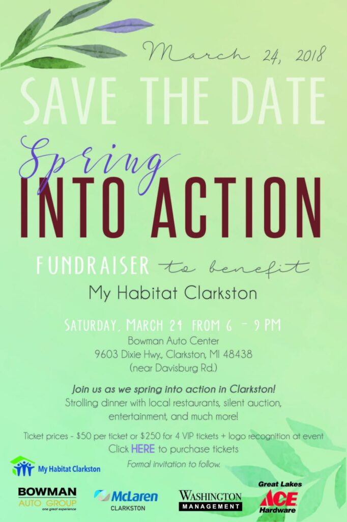 Save the Date – Fundraiser to Benefit My Habitat Clarkston Saturday, March 24 from 6 – 9 PM Bowman Auto Center 9603 Dixie Hwy., Clarkston, MI 48438 (near Davisburg Rd.) […]